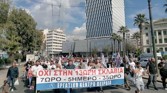 A 13-hour workday means more exploitation, so that money is spared for arms, wars, and deals with the murderous state of Israel. Governments, capitalist parties, and the EU, who deprive us of wages and rights, are the same ones who cover up the genocide and massacre of the Palestinian people.